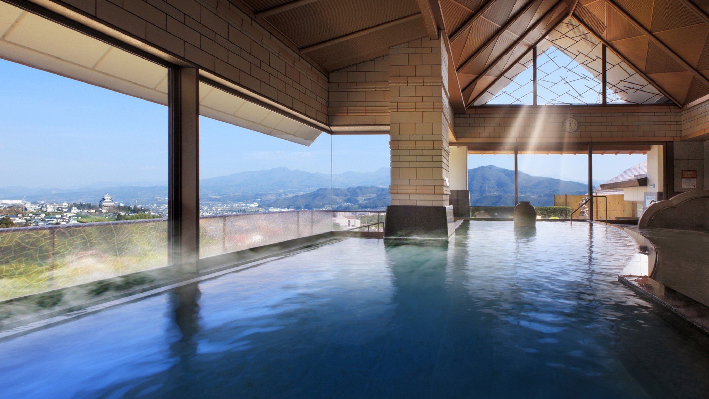 内風呂は浴槽が広めで他人との距離にあまり気を使わず広々と利用できたり、大きなガラス窓からの景色も良い。